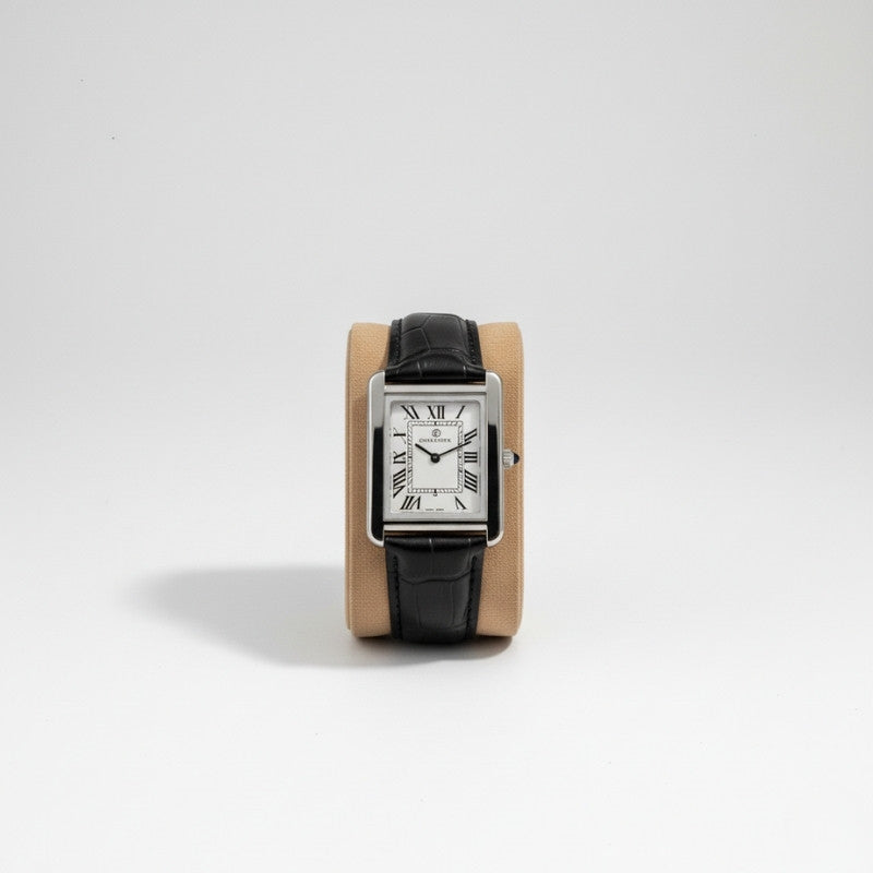 Inspirado no icônico, o Rettangolo é um tributo à elegância geométrica. Com caixa retangular, mostrador com algarismos romanos e pulseira em couro, este modelo é pura herança visual. Seu design atravessa gerações, ideal para quem valoriza sobriedade, precisão e um toque de tradição no pulso.